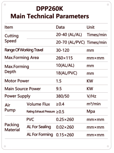 تشكيل الآلية، والتغذية التلقائية الخاصة، والختم، وثقوف، النقش والقطع. مناسبة ALU / PVC & Alu / Alu تعبئة نفطة للأجهزة اللوحية والكبسولات والأجهزة اللوحية غير النظامية، إلخ.